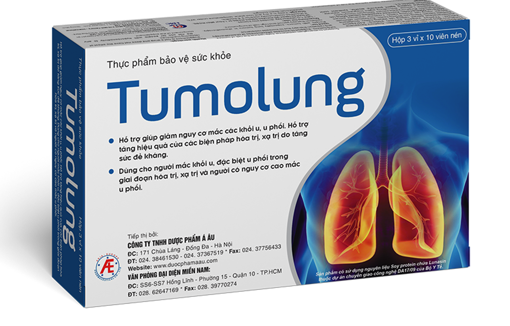 Thực phẩm bảo vệ sức khỏe Tumolung - Hỗ trợ giúp giảm nguy cơ mắc các khối u, u phổi. Dùng cho người mắc khối u, u phổi ![]() Thành phần Mỗi viên nén bao gồm: ● Lunatumo (Đạm đậu nành chứa Lunasin, Cao khổ sâm bắc, Chiết xuất Cỏ xạ hương (Thyme)) 250mg; ● Cao hoàng kỳ 120mg (tương đương 295mg dược liệu); ● Cao Bán chi liên 70mg (tương đương 370mg dược liệu); ● Cao Bồ công anh 70mg (tương đương 315mg dược liệu); ● Cao Cọ xẻ (Quy tô tử) 50mg (tương đương 550mg dược liệu); ● Cao Quả khế 50mg (tương đương 70mg dược liệu); ● Cao Mạch chủ (Candied jujube) 50mg (tương đương 70mg dược liệu). Phụ liệu: Lactose, chất chống đông vón magie stearat, chất tạo màng bao polyvinyl alcohol, chất màu tổng hợp titanium dioxide vừa đủ. Đối tượng sử dụng: Dùng cho người mắc khối u, đặc biệt u phổi trong giai đoạn hóa trị, xạ trị và người có nguy cơ cao mắc u phổi. Công dụng: ● Tăng cường chống oxy hóa, hỗ trợ giảm nguy cơ viêm nhiễm. ● Hỗ trợ tăng cường sức đề kháng, giúp giảm nguy cơ mắc các khối u, u phổi. ● Hỗ trợ tăng hiệu quả của các biện pháp hóa trị, xạ trị do tăng sức đề kháng.