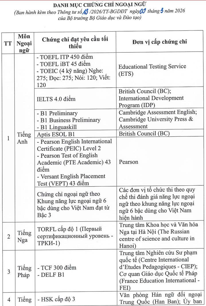 Theo danh mục chứng chỉ Ngoại ngữ vừa được cập nhật theo Thông tư số 13/TT-BGDĐT ngày 9/3/2026 về việc sửa đổi, bổ sung một số điều của Quy chế thi tốt nghiệp trung học phổ thông ban hành kèm theo Thông tư số 24/2024/TT-BGDĐT ngày 24/12/2024, có thêm chứng chỉ tiếng Hàn TOPIK và chứng chỉ tiếng Anh quốc tế Versant English Placement Test (VEPT).