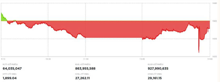 Tuy nhiên, sau thời điểm 14h, với tâm điểm là cổ phiếu liên quan đến VIC là VHM giảm nhanh cùng sắc đỏ mở rộng trong nhóm VN30 đã khiến VN-Index thêm một nhịp giảm mạnh về dưới 1.650 điểm trước khi bật lên, thu hẹp đà giảm về cuối ngày, nhờ lực đỡ từ cổ phiếu VIC vững vàng và các bluechip hồi phục đôi chút so với mức đáy.