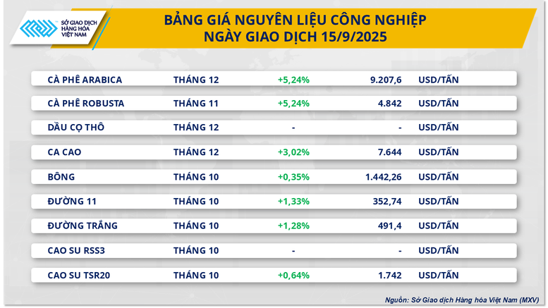 Khép lại phiên giao dịch ngày hôm qua, thị trường nguyên liệu công nghiệp ghi nhận lực mua áp đảo trên hầu hết các mặt hàng chủ chốt. Đáng chú ý, giá cà phê tiếp tục trải qua phiên giao dịch bùng nổ khi cả hai mặt hàng đều đồng loạt tăng mạnh trên 5,2%. Kết phiên, giá cà phê Arabica neo ở mức 9.207 USD/tấn, trong khi cà phê Robusta cũng trở lại vùng 4.842 USD/tấn.