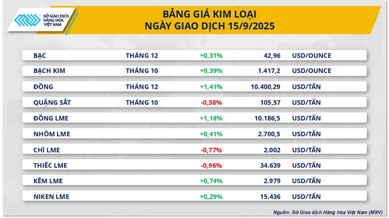Không nằm ngoài xu hướng chung của thị trường, nhóm kim loại cũng ghi nhận lực mua áp đảo khi có tới 7/10 mặt hàng đồng loạt tăng giá. Đáng chú ý, bạch kim tiếp tục duy trì đà tăng sang phiên thứ tư liên tiếp khi nhích thêm 0,39% lên mức 1.417,2 USD/ounce.