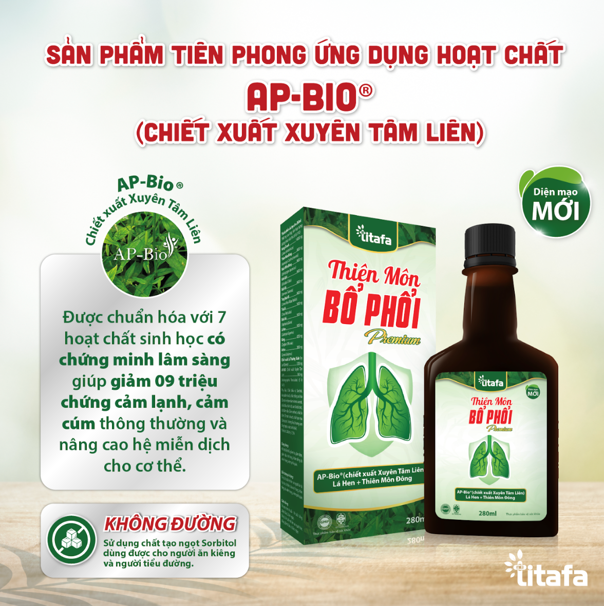 Titafa là đơn vị đầu tiên ứng dụng AP‑Bio® vào sản phẩm hỗ trợ hô hấp tại Việt Nam – Một bước tiến tiên phong, phá vỡ giới hạn của các sản phẩm siro ho thảo dược thông thường vốn chưa có thành phần xuyên tâm liên chuẩn hóa.