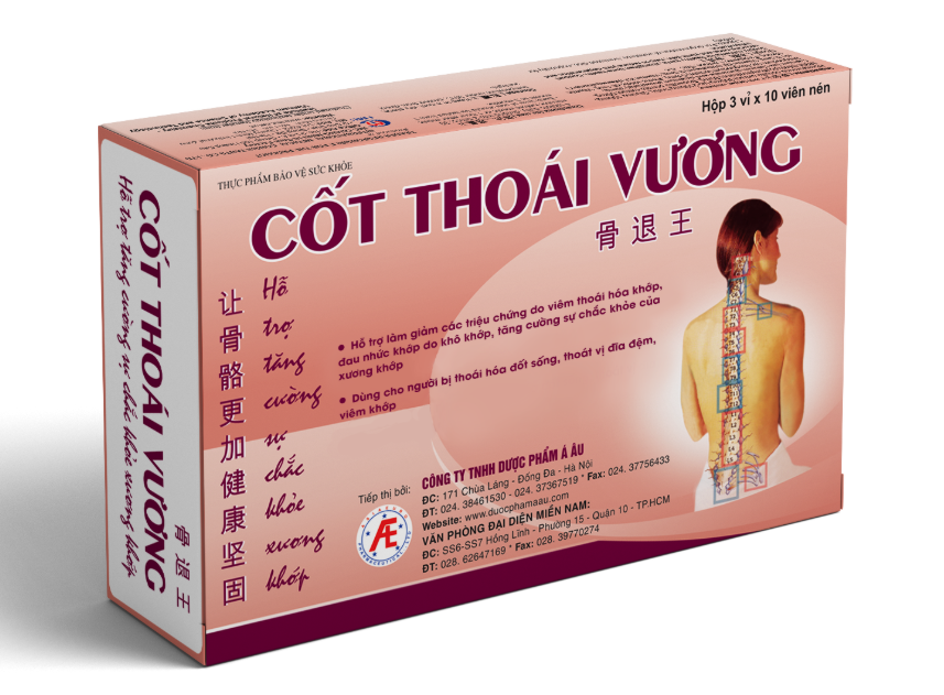 Thực phẩm bảo vệ sức khỏe Cốt Thoái Vương - Hỗ trợ tăng cường sự chắc khỏe xương khớp ![]() *Thành phần: Dầu vẹm xanh, cao thiên niên kiện, chiết xuất nhũ hương, MSM (Methylsulfonylmethane), Canxi, Glycine, Vitamin B1, B2, Magie, Vitamin K2. *Công dụng: - Hỗ trợ làm giảm các triệu chứng do viêm thoái hóa khớp, đau nhức khớp do khô khớp. - Bổ sung các dưỡng chất cần thiết cho khớp. - Hỗ trợ tăng cường sự chắc khỏe của xương khớp. *Đối tượng sử dụng: - Thích hợp với người bị thoái hóa đốt sống, thoát vị đĩa đệm, viêm khớp. *Hướng dẫn sử dụng: - Ngày uống 4 viên, chia làm 2 lần, 30 phút trước khi ăn hoặc sau ăn 1 giờ. - Mỗi đợt sử dụng nên kéo dài từ 3 đến 6 tháng. Tiếp thị và phân phối bởi: Công ty TNHH Dược phẩm Á Âu. Á Âu - Địa chỉ an tâm, tin cậy, chất lượng suốt 20 năm. Địa chỉ: 171 Phố Chùa Láng - Phường Láng Thượng - Quận Đống Đa - Hà Nội. ĐT: 024.38461530 - 028.62647169. Giấy phép XNQC: 02496/2019/ATTP-XNQC. *Thực phẩm này không phải là thuốc và không có tác dụng thay thế thuốc chữa bệnh. *Sản phẩm được bán tại các nhà thuốc trên toàn quốc. |