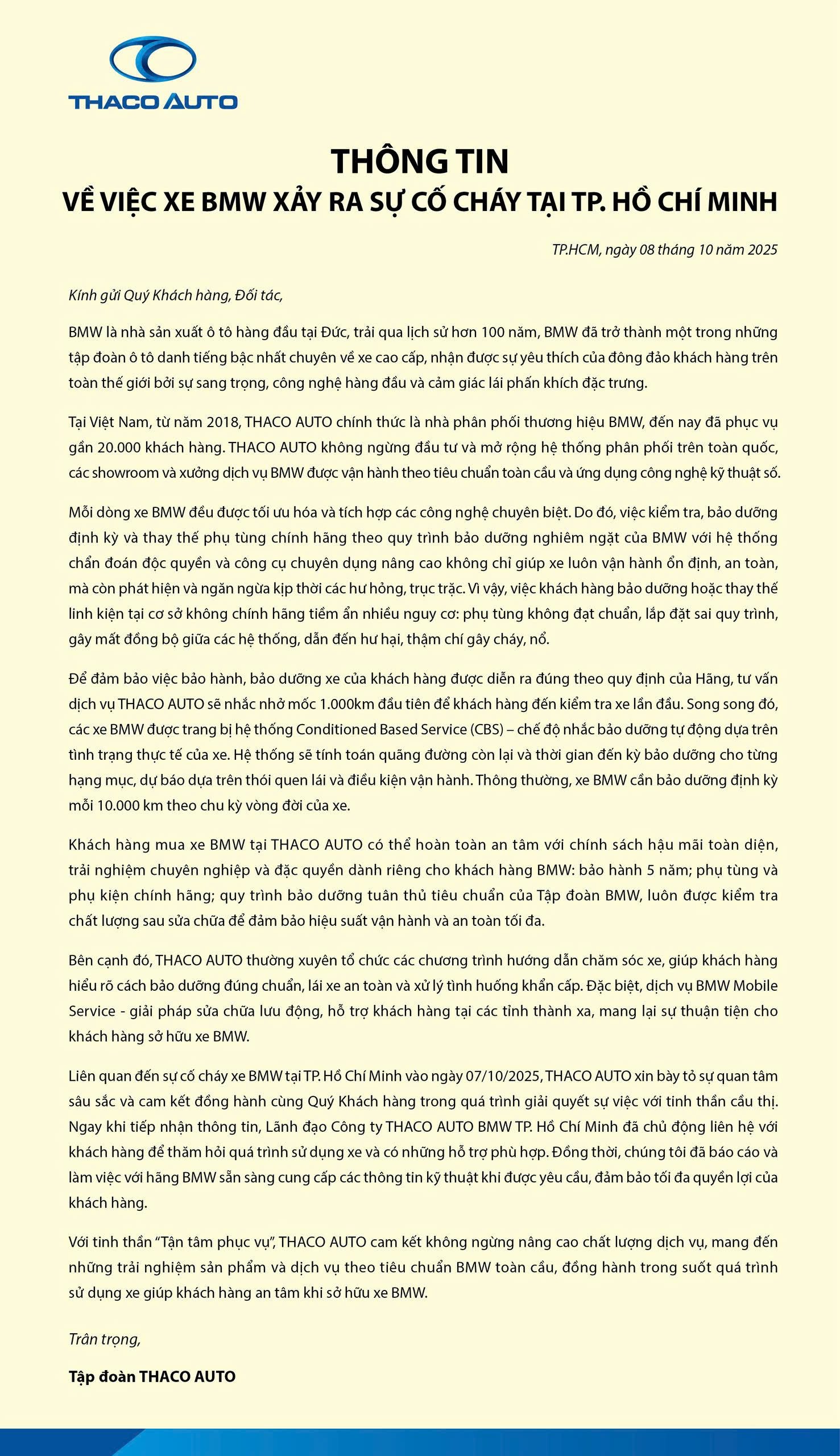 THACO AUTO trân trọng thông tin đến Quý Khách hàng, Quý Đối tác và Quý cơ quan báo chí, truyền thông về việc xe BMW xảy ra sự cố cháy tại TP. Hồ Chí Minh, thể hiện sự quan tâm và cam kết đồng hành cùng khách hàng trong quá trình xử lý vụ việc.