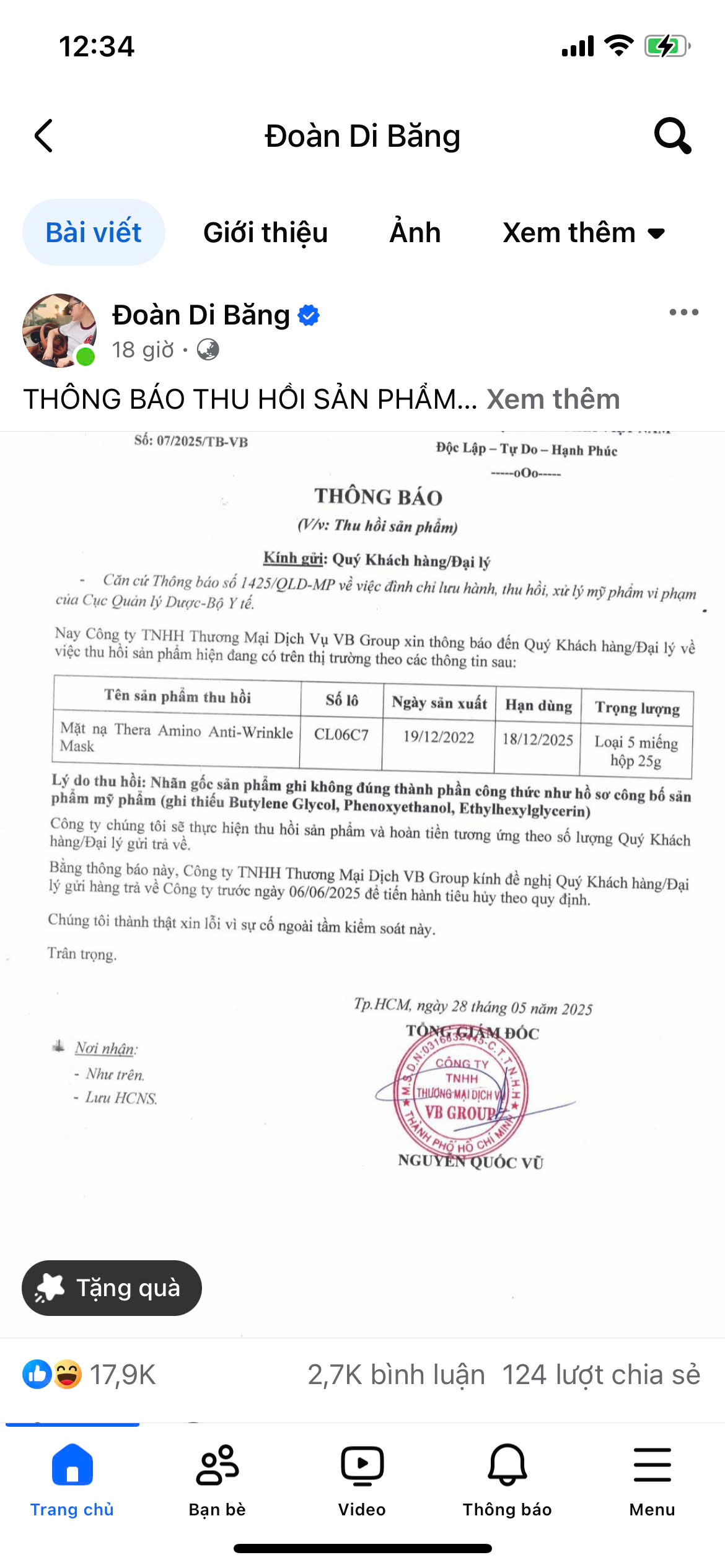 Cụ thể, ngày 28/5, ca sĩ Đoàn Di Băng thông báo về việc thu hồi sản phẩm mặt nạ G-Thera Amino Anti-Wrinkle Mask. Căn cứ Thông báo số 1425/QLD-MP của Cục Quản lý Dược, Bộ Y tế về việc đình chỉ lưu hành, thu hồi, xử lý mỹ phẩm vi phạm, Công ty TNHH Thương Mại Dịch Vụ VB Group (Công ty VB Group) trân trọng thông báo đến Quý Khách hàng và Đại lý về việc thu hồi sản phẩm Mặt nạ Thera Amino Anti-Wrinkle Mask.