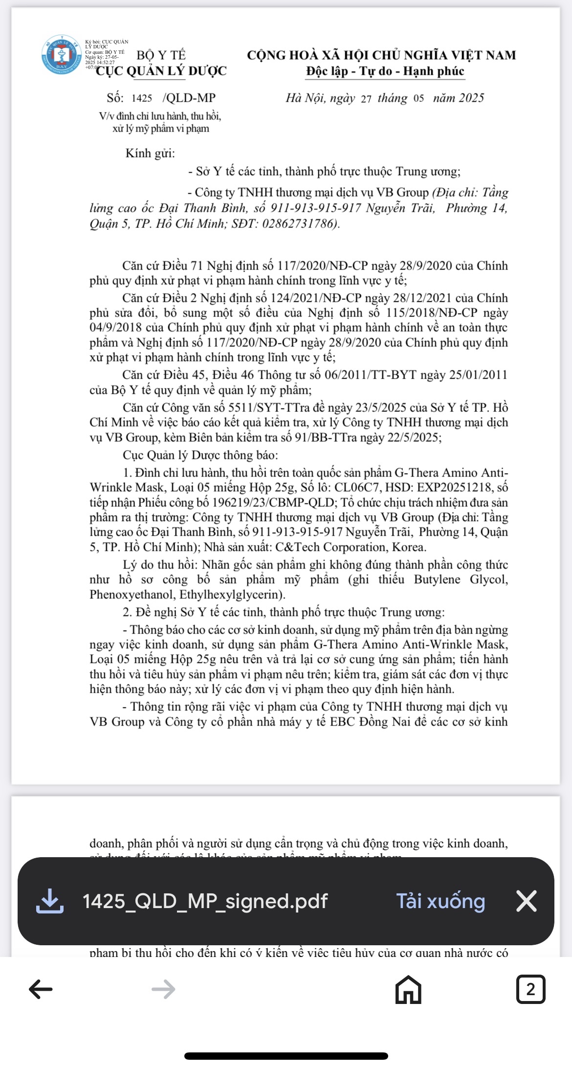 Đặc biệt, Cục Quản lý Dược đề nghị Sở Y tế TP. HCM tiến hành giám sát Công ty VB Group trong việc thực hiện thu hồi sản phẩm G-Thera Amino Anti-Wrinkle Mask, Loại 05 miếng Hộp 25g không đáp ứng quy định; Báo cáo kết quả giám sát về Cục Quản lý Dược trước ngày 11/7/2025.