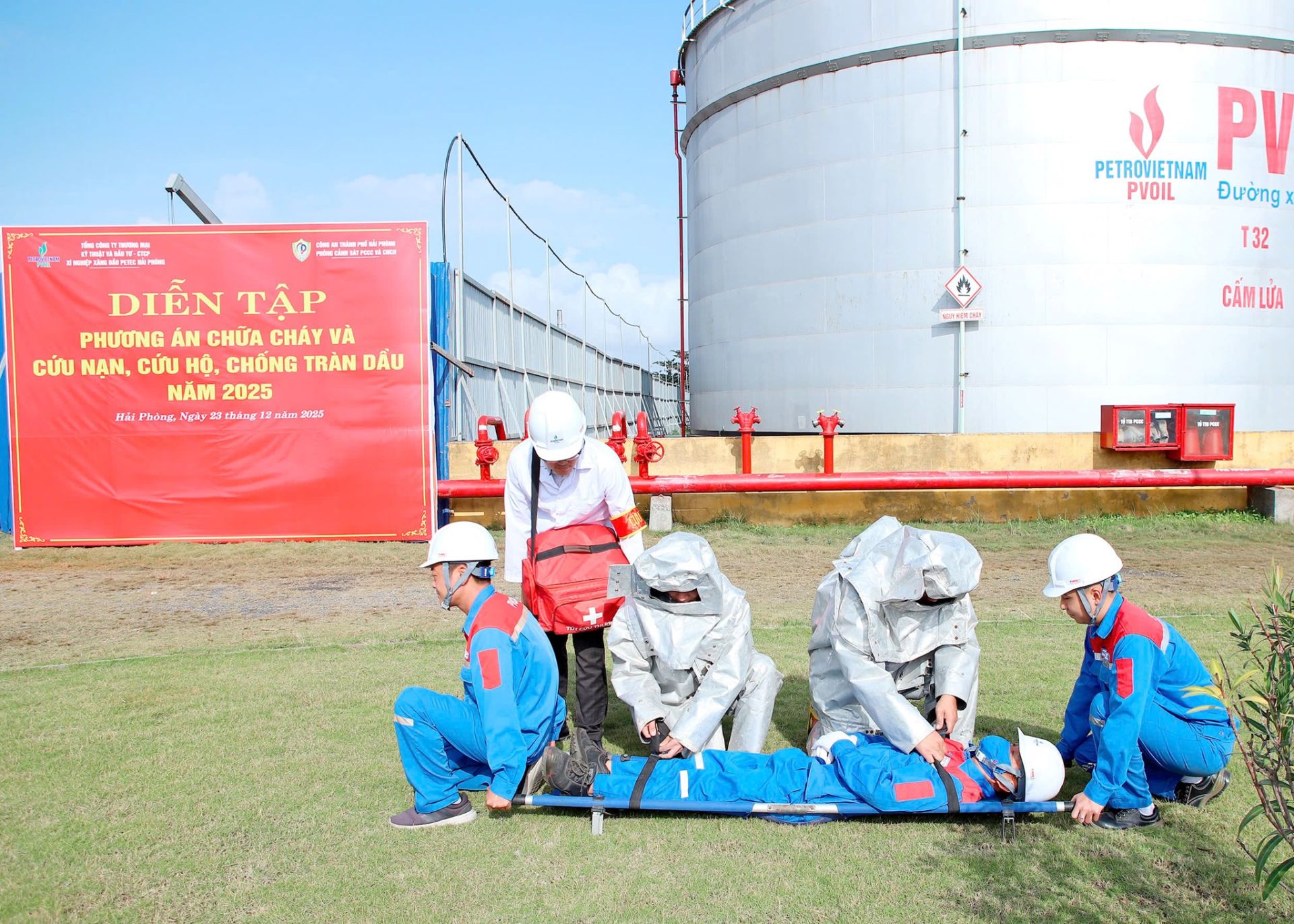 Theo đó, tham gia buổi thực tập với 100 người gồm lực lượng PCCC cơ sở, cán bộ công nhân viên Xí nghiệp cùng xử lý tình huống xảy ra cháy tại bãi van cửa bể T32 chứa xăng RON 95-III tại Xí nghiệp xăng dầu PETEC Hải Phòng. Do dám cháy xảy ra tại khu vực bể chứa xăng, dầu, nguy cơ cháy lan sang các bể lân cận và xăng dầu tràn ra có nguy cơ theo đường thoát nước cháy lan sang khu vực khác.