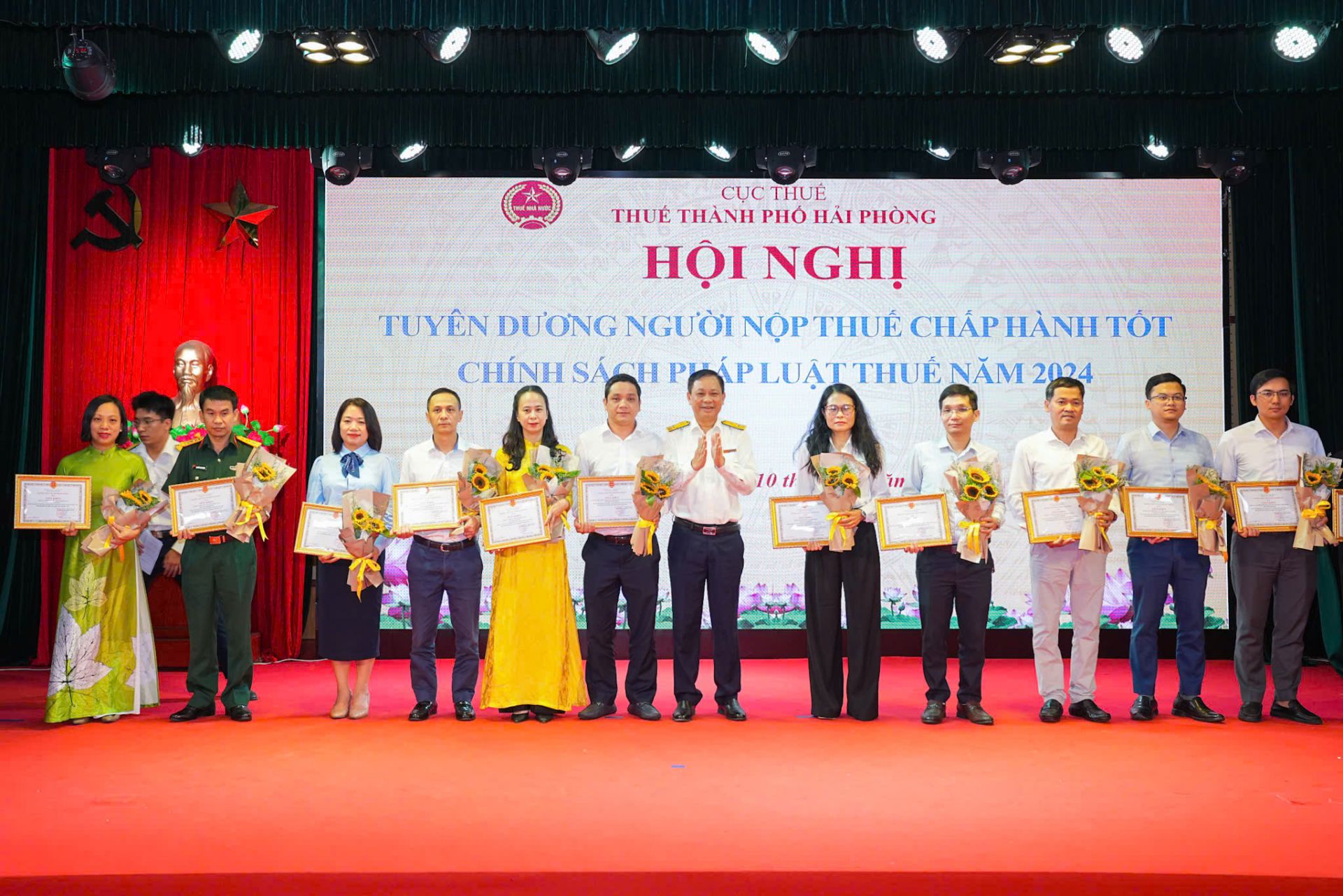 Tại Hội nghị, 101 doanh nghiệp, doanh nhân và người nộp thuế tiêu biểu trên địa bàn thành phố Hải Phòng đã được Thuế thành phố tặng Giấy khen vì có thành tích xuất sắc trong việc chấp hành tốt chính sách, pháp luật thuế năm 2024, góp phần tích cực vào công tác thu ngân sách và phát triển kinh tế – xã hội của thành phố.