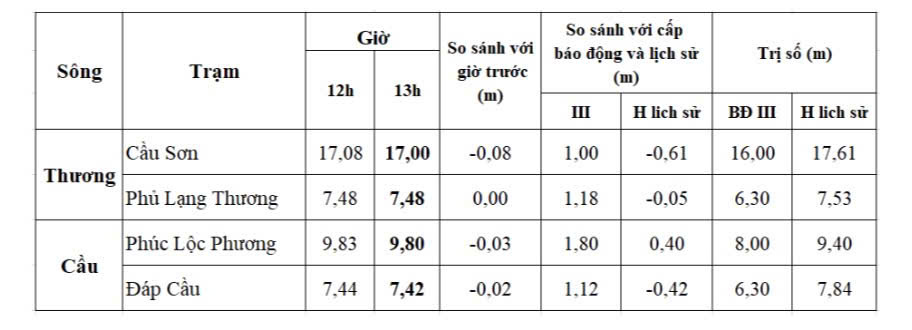 - Tại Phúc Lộc Phương xuống mức (9.20 - 9.30m) trên mức báo động III; Đáp Cầu tiếp tục xuống chậm ở mức (7.00 - 7.10m) trên mức báo động III.