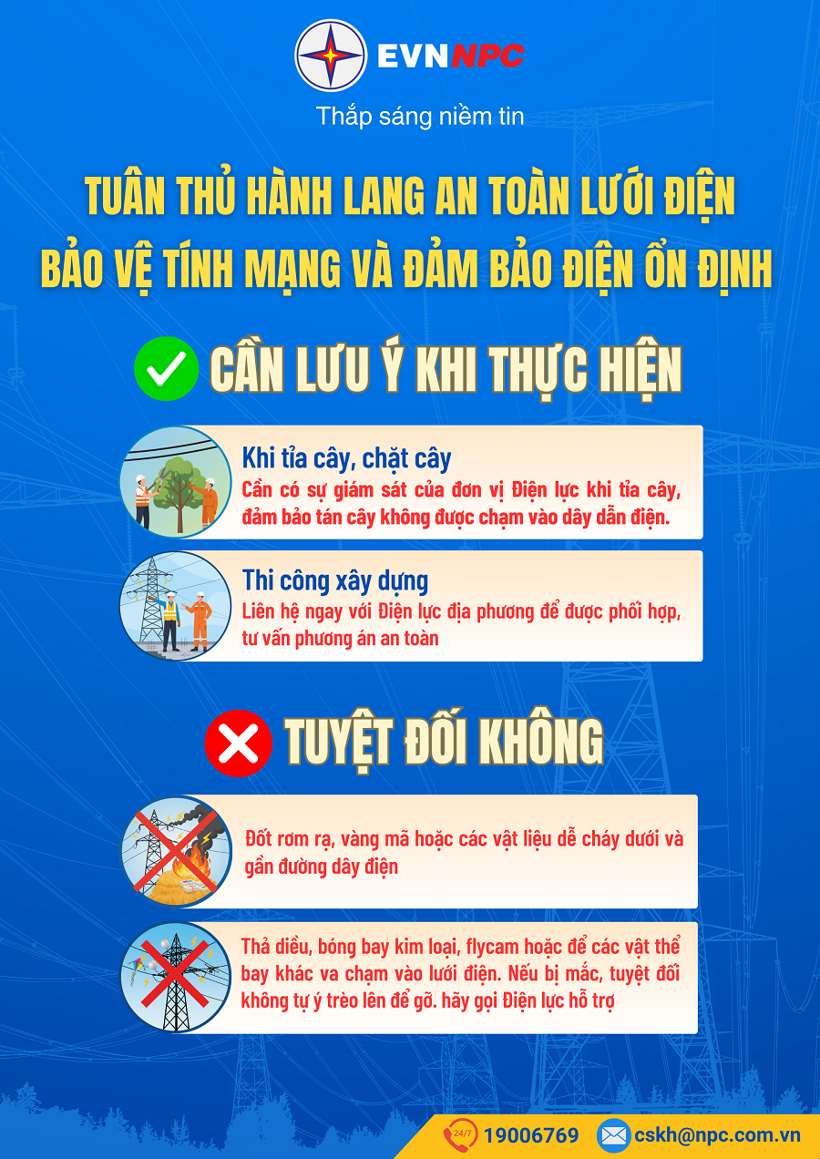 Thi công xây dựng gần đường dây hoặc Trạm Biến áp có nguy cơ vi phạm khoảng cách an toàn điện: Liên hệ ngay với Đội quản lý Điện lực địa phương để được phối hợp, tư vấn phương án an toàn.