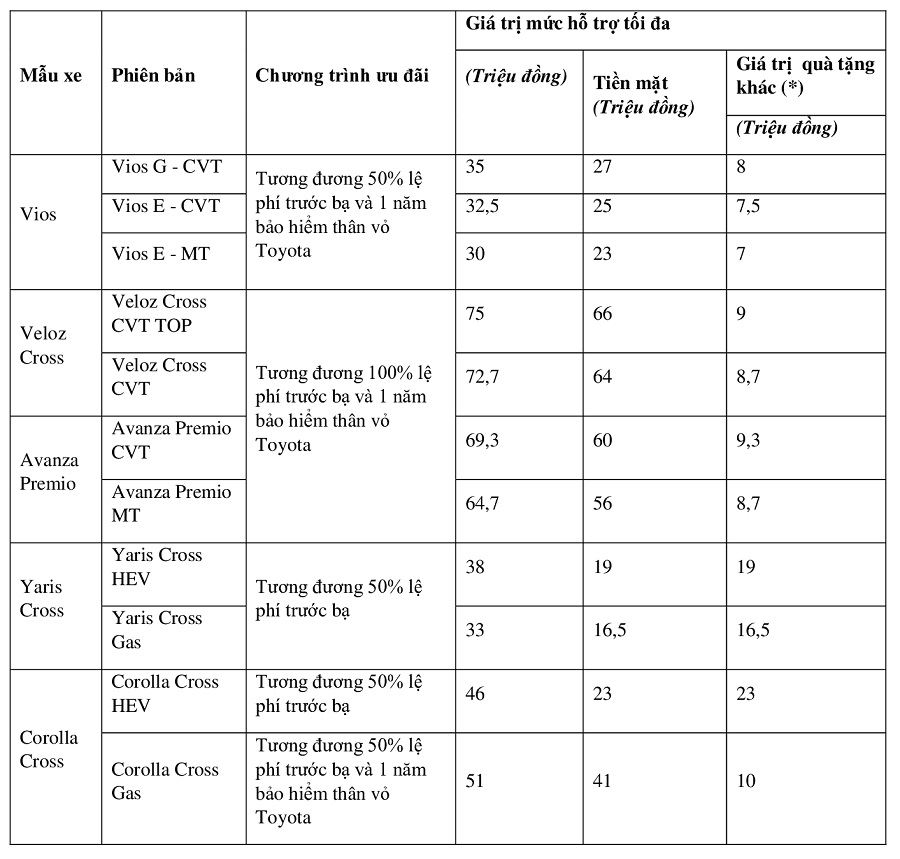 Với các mẫu xe Corolla Cross bản HEV và mẫu xe Yaris Cross: Giá trị quà tặng theo chính sách của Đại lý.
