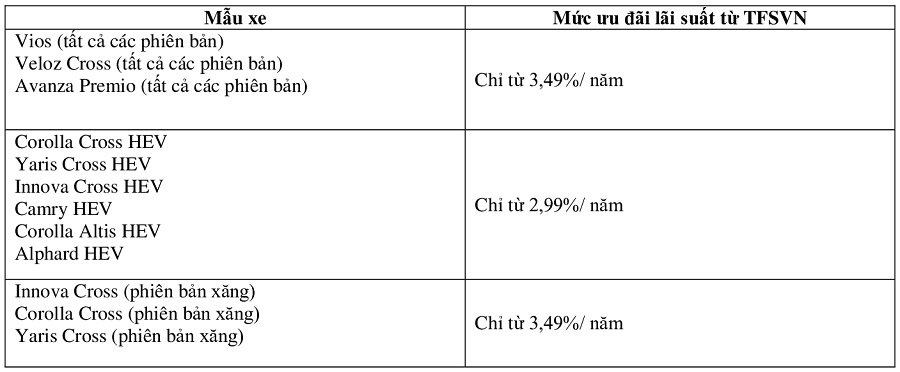 Lưu ý: Thông tin và điều kiện áp dụng chi tiết của chương trình ưu đãi lãi suất của TFSVN trong tháng 8/2025, Quý khách hàng vui lòng tham khảo thông báo từ TFSVN hoặc liên hệ các Đại lý Toyota trên toàn quốc để được tư vấn.