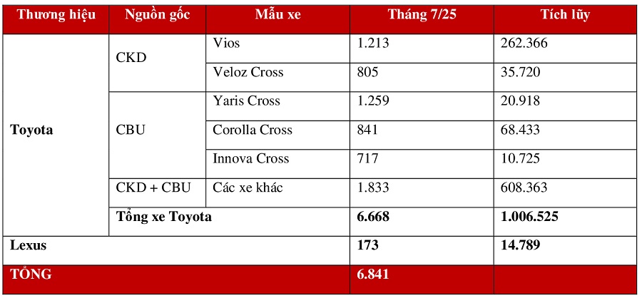 Cụ thể, doanh số toàn quốc của các mẫu xe Toyota đạt 6.668 xe, bao gồm 2.397 xe lắp ráp trong nước và 4.271 xe nhập khẩu nguyên chiếc. Tính đến hết tháng 7 năm 2025, Toyota đã bàn giao tổng cộng gần 36 nghìn xe đến tay khách hàng, ghi nhận mức tăng trưởng ấn tượng 25% so với cùng kỳ năm 2024.
