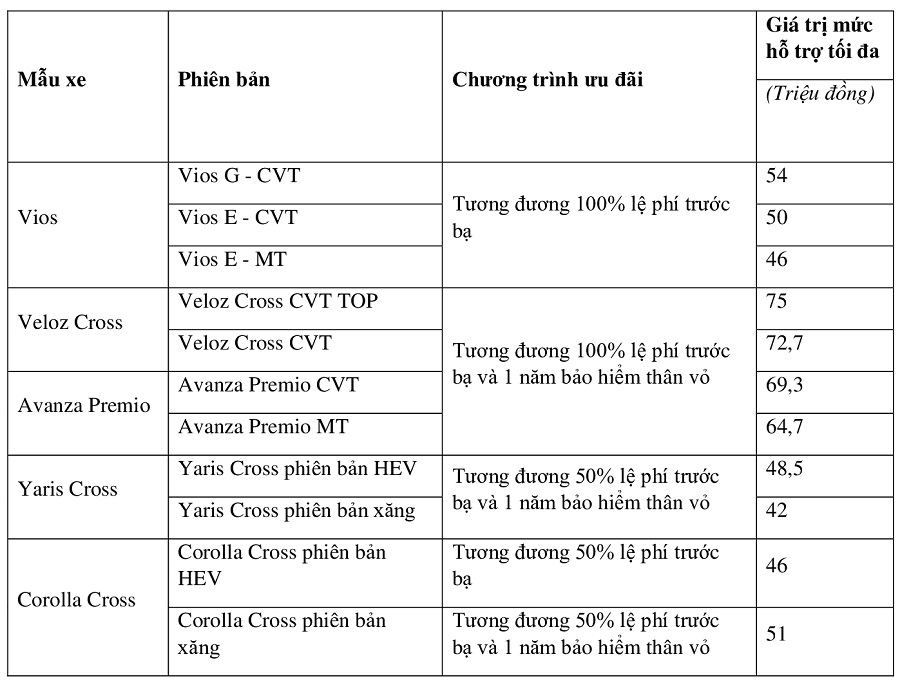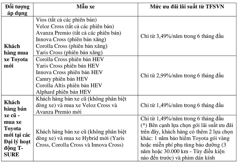 Thông tin và điều kiện áp dụng chi tiết của chương trình ưu đãi lãi suất của TFSVN trong tháng 9/2025, Quý khách hàng vui lòng tham khảo thông báo từ TFSVN hoặc liên hệ các Đại lý Toyota trên toàn quốc để được tư vấn.