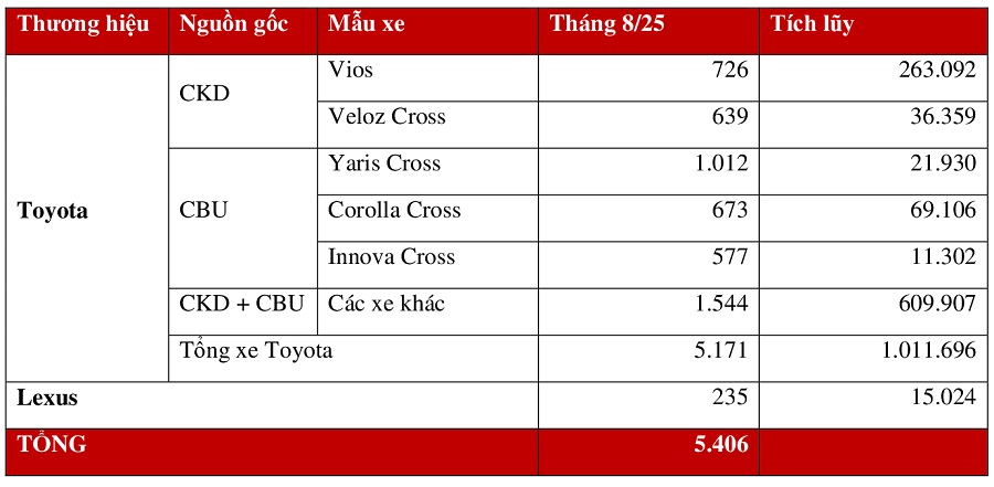 Cụ thể, doanh số toàn quốc của các mẫu xe Toyota đạt 5.171 xe, bao gồm 1.593 xe lắp ráp trong nước và 3.578 xe nhập khẩu nguyên chiếc. Tính đến hết tháng 8 năm 2025, Toyota đã bàn giao tổng cộng hơn 41 nghìn xe đến tay khách hàng, ghi nhận mức tăng trưởng ấn tượng 23% so với cùng kỳ năm 2024.