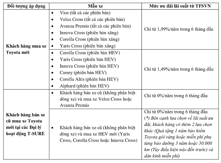 Thông tin và điều kiện áp dụng chi tiết của chương trình ưu đãi lãi suất của TFSVN trong tháng 10/2025, Quý khách hàng vui lòng tham khảo thông báo từ TFSVN hoặc liên hệ các Đại lý Toyota trên toàn quốc để được tư vấn.