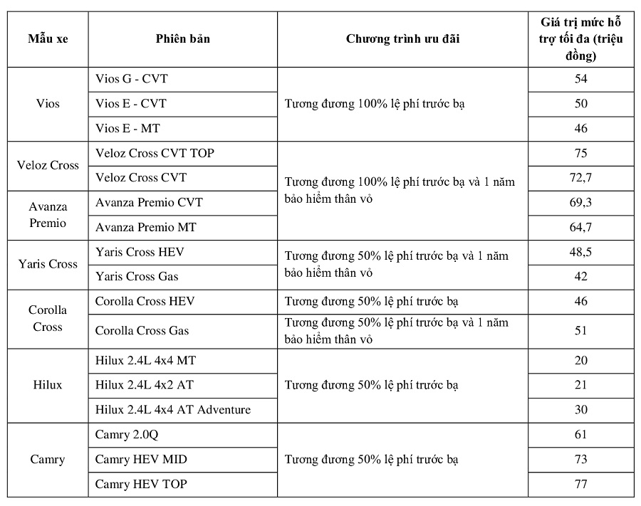 Trong tháng 10/2025, TMV và Công ty Tài chính Toyota Việt Nam (TFSVN), cùng hệ thống các Đại lý Toyota trên toàn quốc triển khai chương trình khuyến mại siêu hấp dẫn dành cho khách hàng. Thông tin chương trình cụ thể như sau: