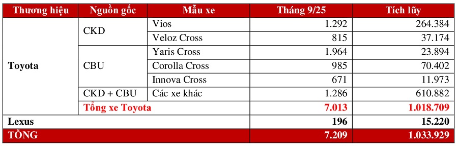 Cụ thể, doanh số toàn quốc của các mẫu xe Toyota đạt 7.013 xe, bao gồm 2.338 xe lắp ráp trong nước và 4.675 xe nhập khẩu nguyên chiếc và ghi nhận mức tăng trưởng ấn tượng 36% so với tháng trước.