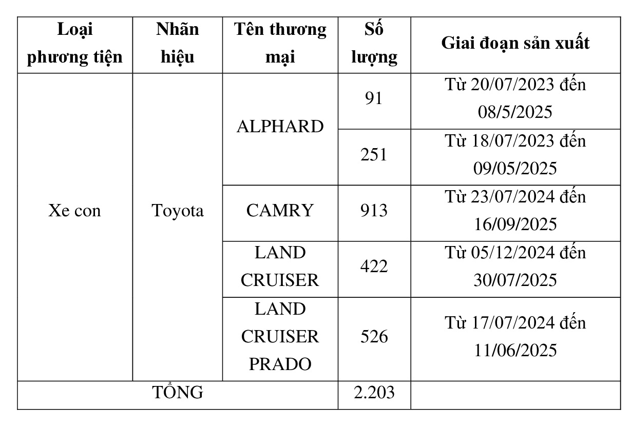 Chương trình được Toyota Việt Nam thực hiện chính thức từ ngày 30/12/2025 tại tất cả các Đại lý Toyota trên toàn quốc. Danh sách và số lượng xe tại Việt Nam bị ảnh hưởng cụ thể như sau: