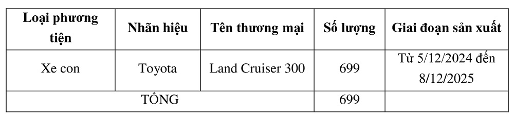 Chương trình sẽ được Toyota Việt Nam thực hiện chính thức từ ngày 27/3/2026 tại tất cả các Đại lý Toyota trên toàn quốc. Danh sách và số lượng xe tại Việt Nam bị ảnh hưởng cụ thể như sau: