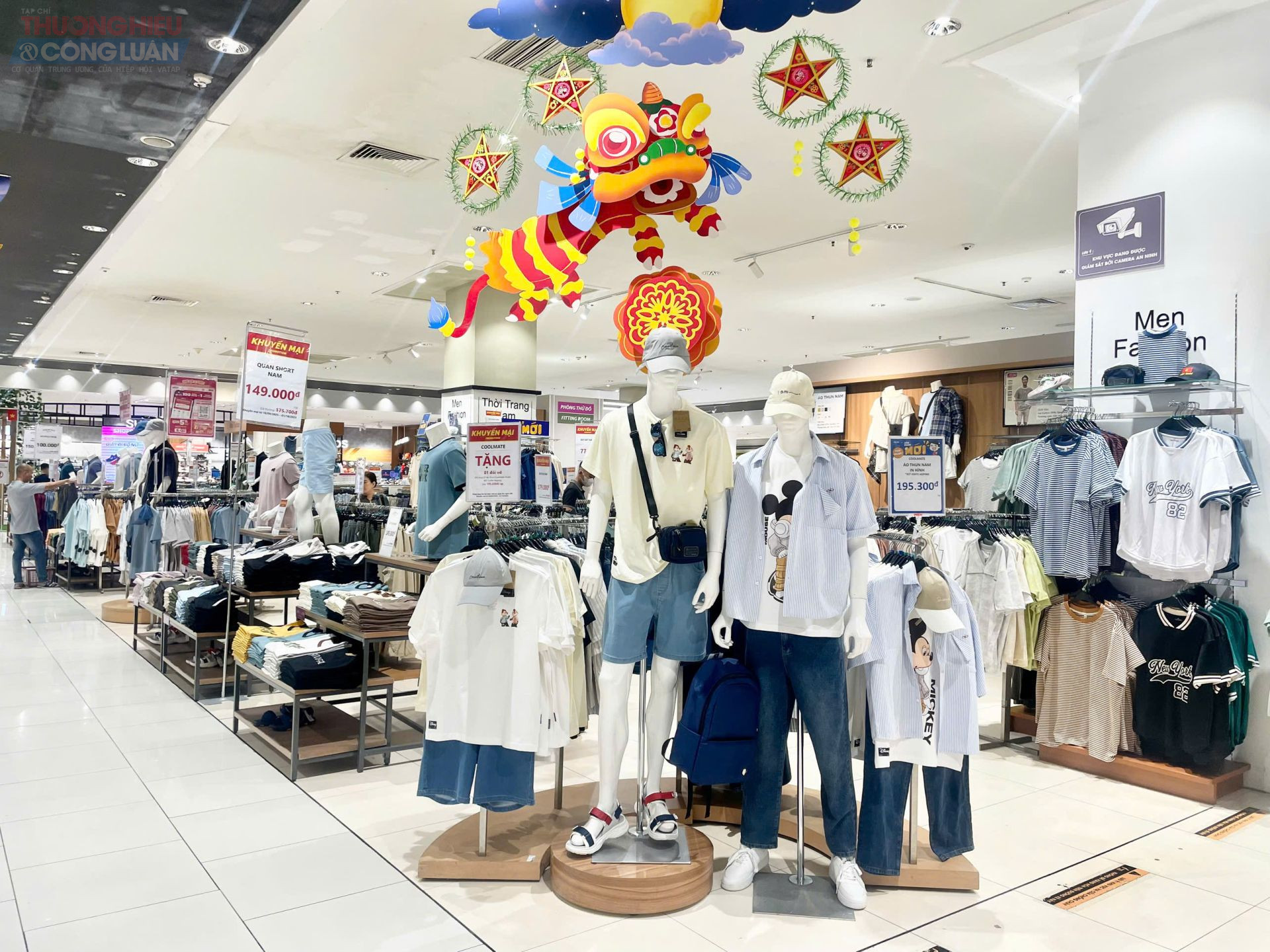 Tại khu mua sắm ở siêu thị các sản phẩm quần áo, đồ dùng gia dụng ngập tràn sắc đỏ khuyến mãi. Các sản phẩm được áp dụng giảm giá sốc như: Thời trang quần áo trẻ em, thời trang nữ, thời trang nam có giá dao động từ 149.000đ – 300.000đ/tùy sản phẩm; đồ dùng nhà bếp như chén bát có giá 59.000đ; dụng cụ nhà bếp có giá chỉ 69.000đ, 79.000đ, 89.000đ/tùy sản phẩm; chảo các loại có giá tốt dao động từ 169.000 – 400.000đ; bên cạnh đó các sản phẩm khác như nồi cơm điện, nước xả vải, gia vị trong nhà bếp… cũng được áp giá khuyến mãi phục vụ người tiêu dùng mua sắm.
