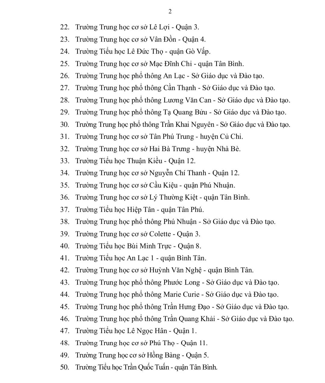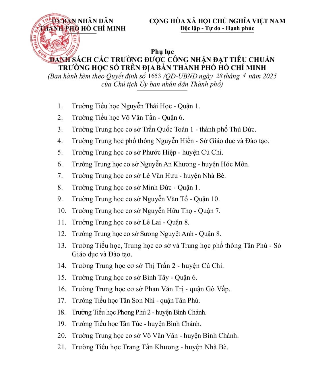 UBND TP. Hồ Chí Minh vừa có quyết định công nhận 100 trường học số đầu tiên. Đây là công trình chào mừng kỷ niệm 50 năm Ngày Giải phóng miền Nam, thống nhất đất nước (30/4/1975 – 30/4/2025).