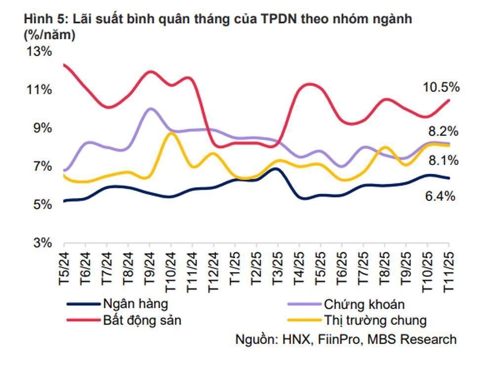 Trong khi đó, nhóm bất động sản chiếm khoảng 22,9% tổng giá trị phát hành, đạt 123,6 nghìn tỷ đồng, tăng mạnh 109,6% so với cùng kỳ. Tuy nhiên, lãi suất bình quân gia quyền của nhóm này lên tới 10,2%/năm, cao nhất thị trường, trong khi kỳ hạn bình quân chỉ khoảng 3,1 năm.