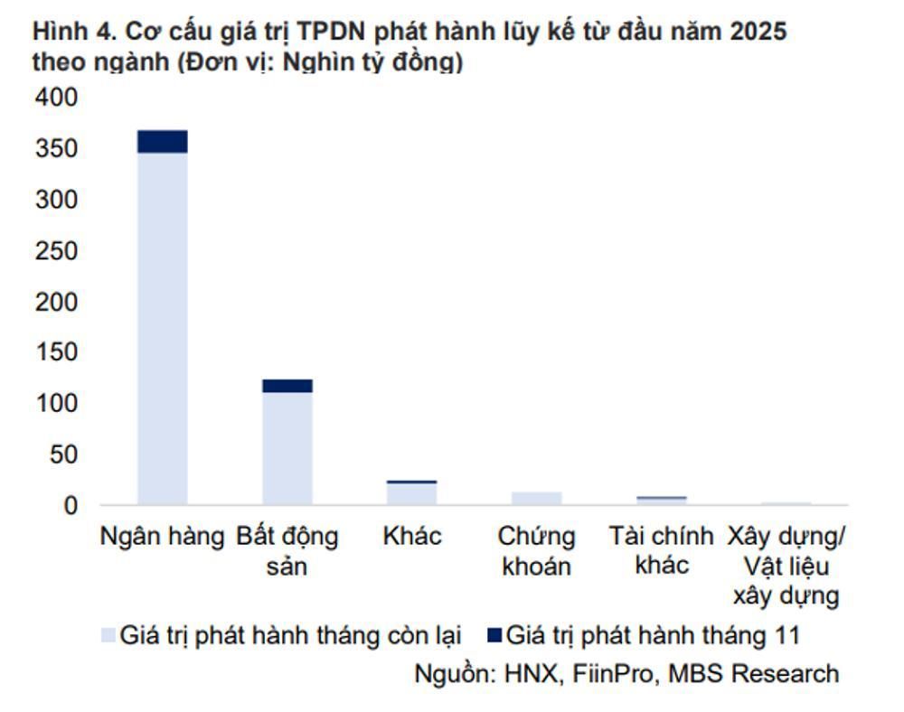 Ngân hàng tiếp tục là nhóm ngành dẫn đầu về quy mô phát hành trái phiếu với tổng giá trị gần 368 nghìn tỷ đồng, tăng 37,7% so với cùng kỳ và chiếm hơn 68% thị phần. Lãi suất bình quân của nhóm này ở mức 5,9%/năm, với kỳ hạn bình quân khoảng 4,5 năm. Các ngân hàng có giá trị phát hành lớn nhất từ đầu năm đến nay gồm Techcombank, ACB và OCB.