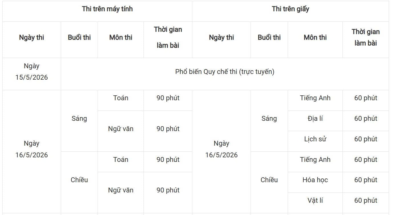 Về đăng ký dự thi, thí sinh thực hiện hoàn toàn trực tuyến từ 9h ngày 25/3 đến 17h ngày 15/4. Thông tin dự thi sẽ được công bố trên tài khoản cá nhân vào ngày 6/5. Trong mỗi ca thi, thí sinh chỉ được đăng ký một môn.