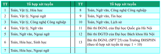 * Tổ hợp xét tuyển: Linh hoạt, bao gồm các tổ hợp truyền thống và tổ hợp có môn Công nghệ, Tin học, Lịch sử, Ngoại ngữ đa dạng (Anh, Pháp, Nga, Trung, Đức, Nhật, Hàn)...