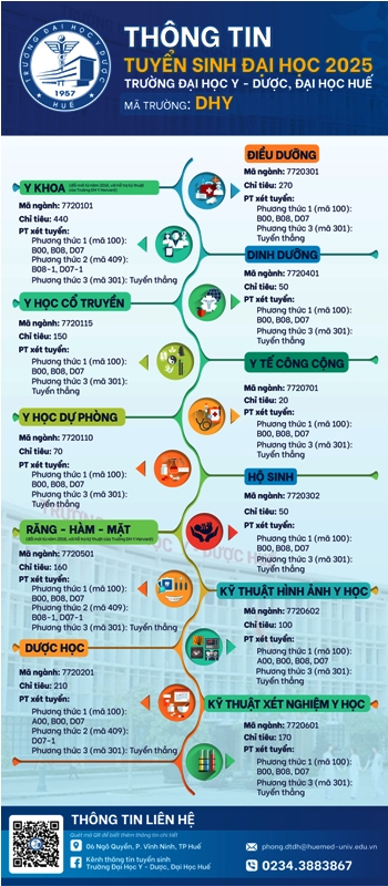 Trong kỳ tuyển sinh đại học năm 2025, Trường Đại học Y - Dược, Đại học Huế áp dụng nhiều phương thức xét tuyển như: Xét kết quả thi tốt nghiệp THPT, xét kết quả thi tốt nghiệp THPT với quy đổi chứng chỉ tiếng Anh quốc tế thành điểm môn tiếng Anh và xét tuyển thẳng theo quy chế của Bộ Giáo dục và Đào tạo, dự bị Trung ương. Trường luôn tạo điều kiện thuận lợi để thí sinh cả nước tiếp cận và nộp hồ sơ, đồng thời sẵn sàng hỗ trợ các thí sinh đến từ vùng sâu, vùng xa, vùng khó khăn.