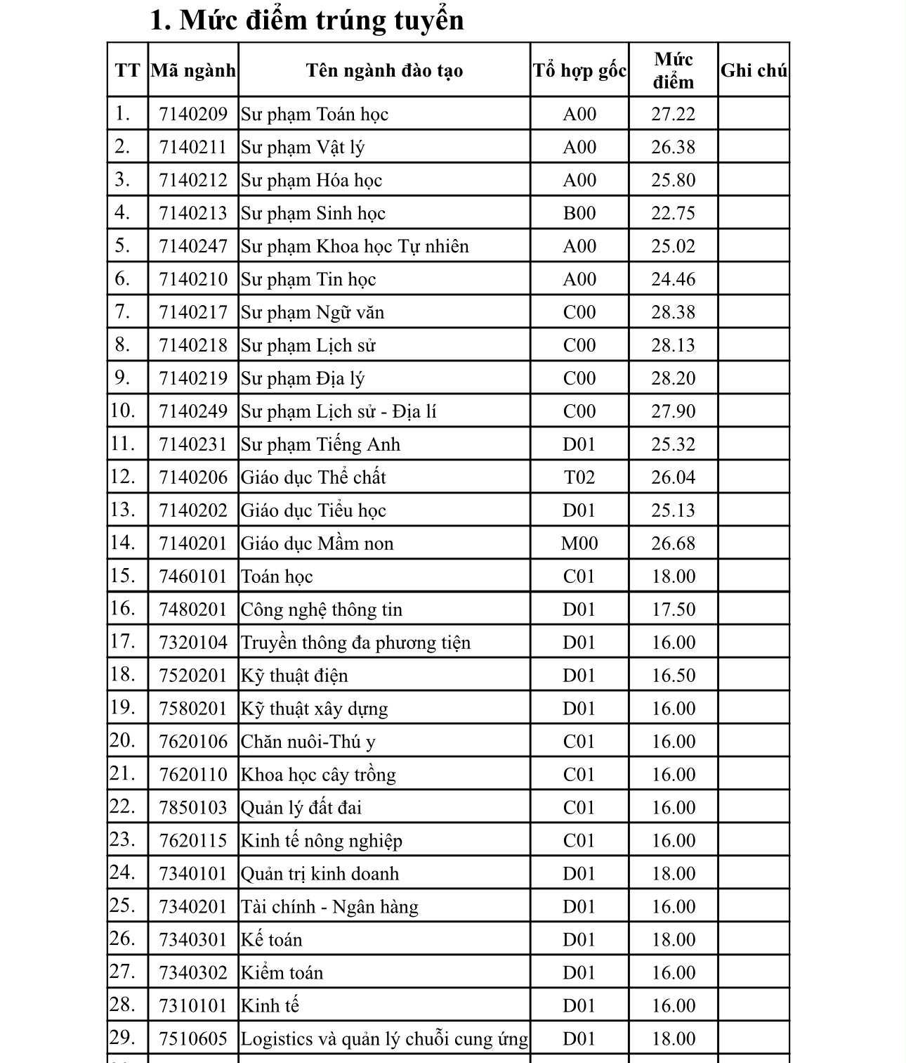 Theo đó, bằng phương thức sử dụng kết quả thi tốt nghiệp THPT năm 2025 Trường ĐH Hồng Đức có điểm trúng tuyển các nhóm ngành/ngành tương đối đồng đều. Nhóm ngành sư phạm có mức điểm trúng tuyển cao nhất, trong đó ngành Sư phạm Ngữ Văn là 28,38 điểm; tiếp đến là Sư phạm Địa Lý, Sư phạm Lịch Sử...
