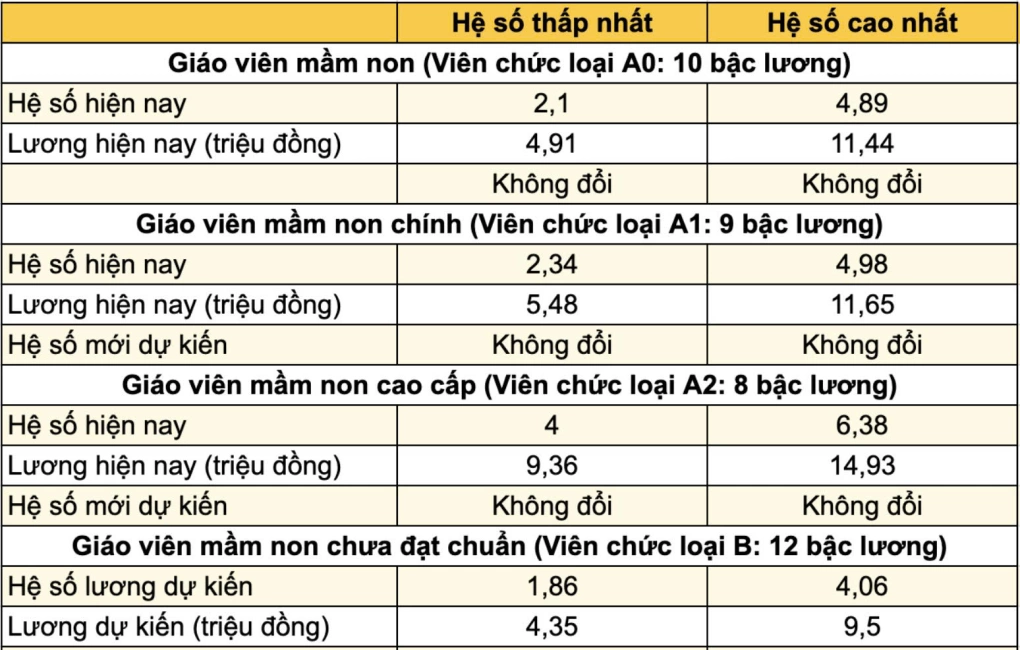 Cụ thể, với giáo viên mầm non, hệ số lương xếp theo chức danh nghề dao động 2,1-6,38, mức này không đổi so với hiện nay. Riêng giáo viên mầm non chưa đạt trình độ chuẩn, hệ số lương dao động từ 1,86-4,06; Với giáo viên tiểu học, THCS và THPT, hệ số lương dao động 2,34-7,55. Trong đó, ở bậc tiểu học, THCS hệ số của giáo viên, giáo viên chính (hạng III và II trước đây) vẫn giữ 2,34-6,38.