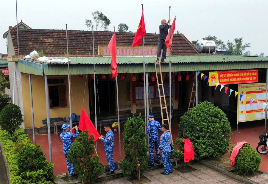 Một số hình ảnh cán bộ, chiến sỹ Hải đội 102 giúp Nhân dân dọn dẹp vệ sinh, cải tạo cảnh quan và trang trí khi vực bầu cử tại thôn Song Giang, xã Đan Hải: