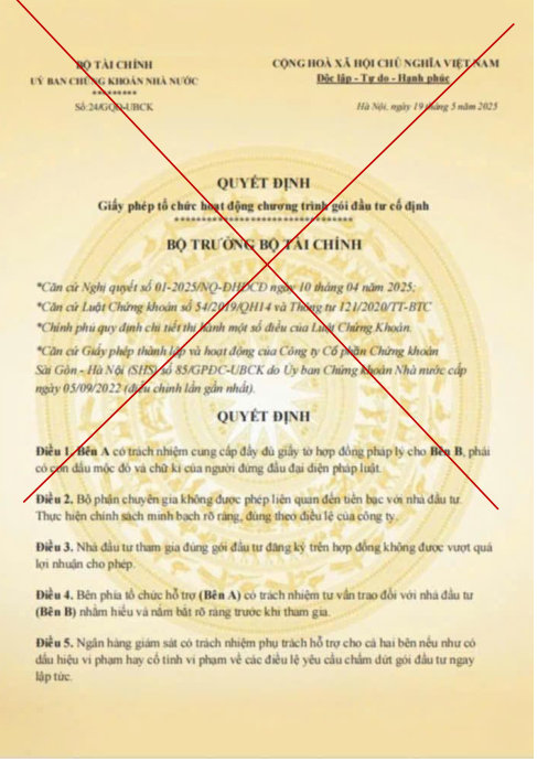 Theo nội dung văn bản giả mạo có tên "Quyết định Giấy phép tổ chức hoạt động chương trình gói đầu tư cố định", các đối tượng mạo danh lãnh đạo Bộ Tài chính, giả mạo con dấu của Bộ.