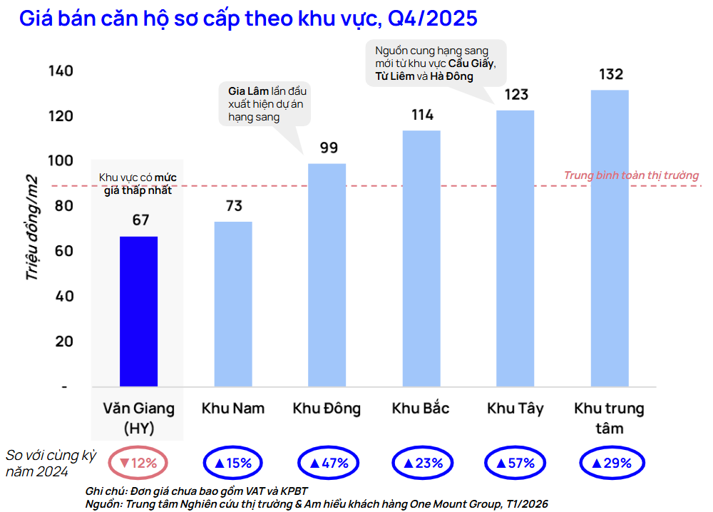 Trong bức tranh đó, Văn Giang nổi bật như khu vực có mức giá “dễ thở” nhất thị trường, với giá bán sơ cấp trung bình chỉ khoảng 67 triệu đồng/m². Trong khi đó, giá căn hộ sơ cấp tại khu vực nội thành Hà Nội đã lên tới khoảng 109 triệu đồng/m², cao gấp 1,6 lần. Điều này đồng nghĩa, giá căn hộ tại Văn Giang chỉ bằng khoảng 62% so với nội đô, tạo ra dư địa tiếp cận nhà ở rõ rệt cho người mua ở thực, đồng thời góp phần quan trọng trong việc giữ mặt bằng giá chung cư toàn thị trường ở trạng thái ổn định hơn.