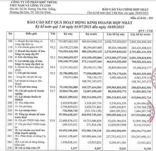 Theo đó, trong quý III/2025, VFG ghi nhận doanh thu thuần đạt 710,5 tỷ đồng, giảm 20% so với cùng kỳ năm ngoái. Trong kỳ, giá vốn hàng bán giảm 100 tỷ đồng về mức 514 tỷ đồng, kéo lãi gộp giảm 28% về 196,2 tỷ đồng.