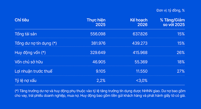 Trong tài liệu trình cổ đông, VIB đặt mục tiêu tăng trưởng dư nợ tín dụng khoảng 15% trong năm 2026, phù hợp với định hướng điều hành của Ngân hàng Nhà nước (NHNN) theo hướng thận trọng trong bối cảnh áp lực lạm phát, biến động lãi suất và rủi ro địa chính trị vẫn tiềm ẩn, đồng thời yêu cầu kiểm soát chất lượng tín dụng và an toàn hệ thống ngày càng được đặt lên hàng đầu. Trên nền tảng đó, Ngân hàng kỳ vọng đạt lợi nhuận trước thuế 11.550 tỷ đồng, tăng 27% so với năm 2025, tiếp tục duy trì hiệu quả hoạt động nhờ tối ưu danh mục tài sản, cải thiện biên lợi nhuận và kiểm soát chi phí.