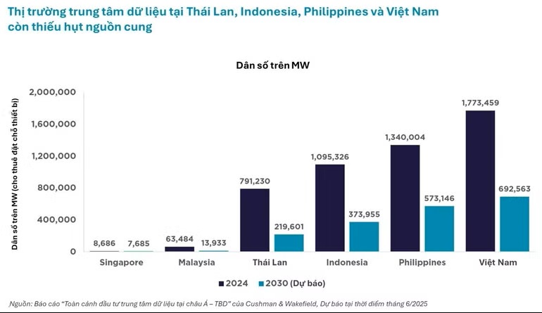 Mặc dù là loại hình bất động sản có giá trị đầu tư lớn nhất tại Đông Nam Á mới nổi, không bao gồm Singapore, trong năm 2025, thị trường trung tâm dữ liệu tại Việt Nam vẫn đang ở giai đoạn đầu so với các quốc gia trong khu vực. Điều này cho thấy dư địa tăng trưởng dài hạn đáng kể, khi nhu cầu về hạ tầng số ngày càng gia tăng cùng với sự phát triển của dịch vụ điện toán đám mây, các ứng dụng AI và nền kinh tế số đang tăng trưởng nhanh của Việt Nam.