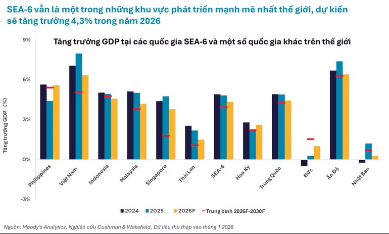 Tuy nhiên, nền kinh tế Việt Nam vẫn được dự báo tăng trưởng 6,3% trong năm 2026, tiếp tục duy trì vị thế là một trong những nền kinh tế tăng trưởng nhanh nhất trong nhóm Đông Nam Á-6.