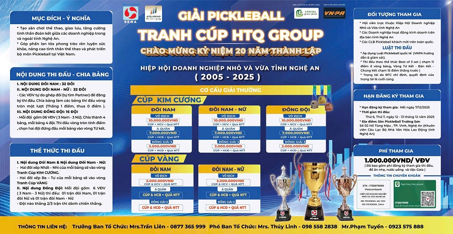 Chương trình kỷ niệm sẽ diễn ra với nhiều hoạt động phong phú, gồm: Giải Pickleball chào mừng tranh CUP HTQ Group với sự tham gia của nhiều tập thể, cá nhân đang công tác tại các cơ quan, ban ngành tỉnh Nghệ An tham gia. Bên cạnh đó, một hoạt động rất ý nghĩa là Lễ tôn vinh doanh nhân, doanh nghiệp tiêu biểu và Gala giao lưu doanh nhân Nghệ An - nơi kết nối, chia sẻ và lan tỏa tinh thần đoàn kết, sáng tạo.