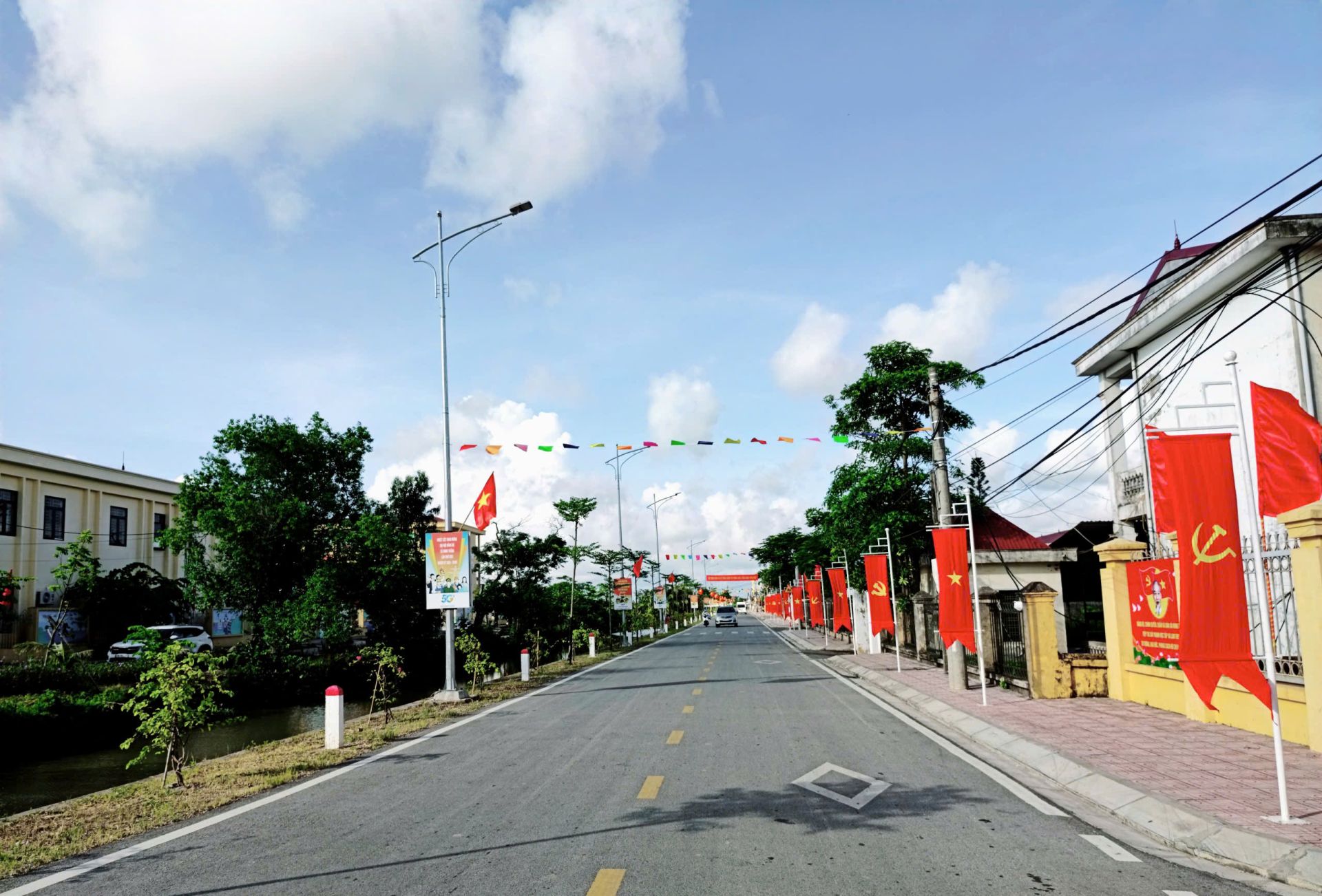Dọc các trục đường chính, tại trụ sở cơ quan, trường học, nhà văn hóa thôn, nhiều pa-nô, áp-phích, băng-rôn, khẩu hiệu được treo trang trọng với nội dung ca ngợi Đảng, Bác Hồ, tinh thần Cách mạng Tháng Tám và Quốc khánh 2/9, đồng thời cổ vũ nhân dân thực hiện các phong trào thi đua yêu nước.